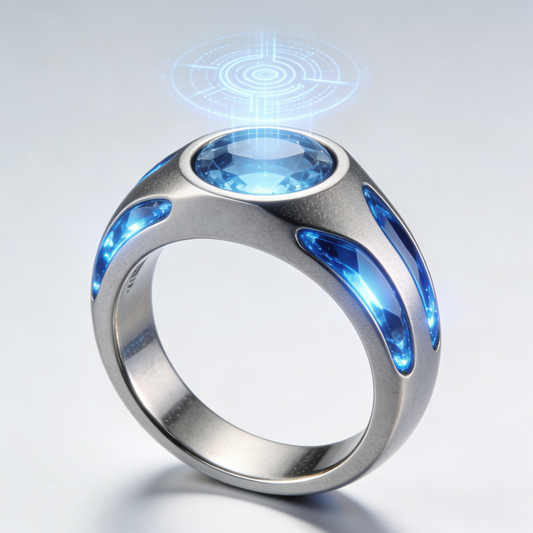 Arcane Core Geometric Ring – Futuristic Blue Crystal & Silver Tech Jewelry