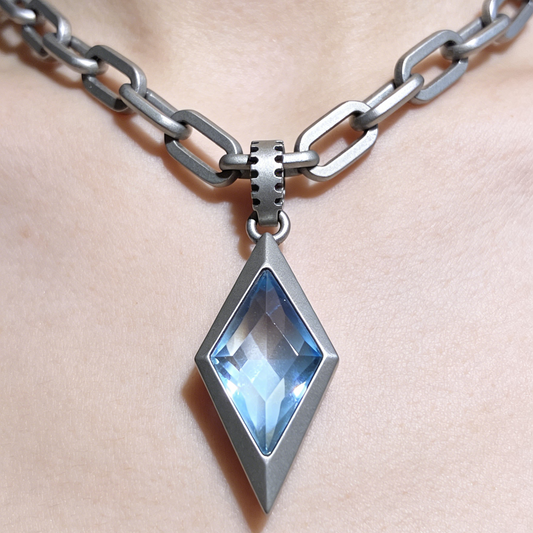 Cybernetic Blue Crystal Pendant Necklace – Futuristic Matte Silver Chain Jewelry
